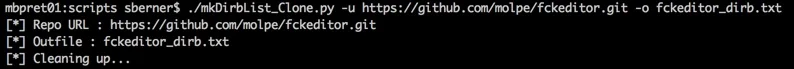So what does that have to do with anything? Well, one of my favorite web vulnerabilities is weak permissions on sensitive files. Think of things like phpMyAdmin, TinyMCE, or FCKeditor etc. Web servers are very rarely setup correctly, and misconfiguration will most likely lead to compromise or at least information leakage. I found myself taking the unique indicators within web applications and searching for the projects on Github. Once I located the github project I was taking the git repo to create a directory and file list for brute forcing later. I believe in automating anything I have to do manually more than five times. So that is what I did. You can find the python script here.