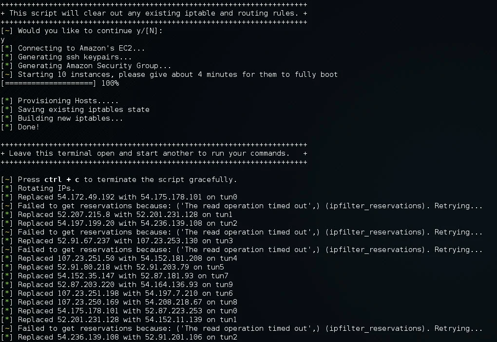 So even by sending your Nessus scans across 10 Amazon EC2 hosts an IPS can still detect and shun one of your exit nodes. To deal with this, we've added the -r feature which will automatically rotate the public IP address of every exit node. Let say for example you fire up proxy cannon with 10 nodes and add the -r switch. The first thing the script will do is build the egress nodes, tunnels, iptables and routes like normal. Next the script will choose one node (at random) and alter the local route table to make that it appear less appealing than the other 9. As a result, all new outbound TCP/UDP/ICMP packets will be traverse the remaining 9 nodes evenly all the while allowing any existing session data on the chosen node time to finish receiving its data. The script will then monitor the network state table for the chosen node. Once it identifies that the node is idle (i.e. no half open TCP/UDP/ICMP packets), proxyCannon tells Amazon to re-assign the nodes WAN IP. Next ProxyCannon will reprovision the host and add it back into the general pool of 10 nodes, and move onto the next. On average, regardless of the number of exit nodes provisioned, proxyCannon will change its exit nodes IP's about 30 times in one hour without dropping / breaking a single session!