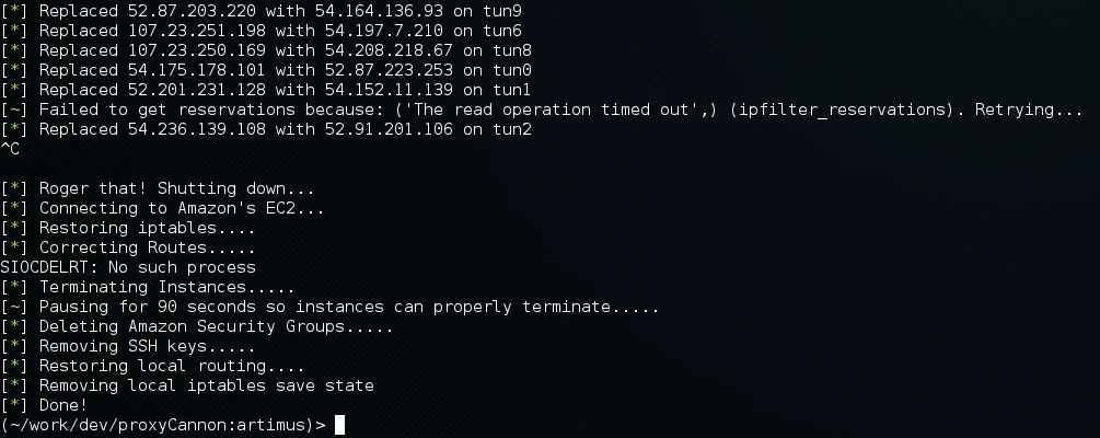 We've added better (not perfect) signal handling, so that if/when an issue arises, ProxyCannon will attempt to cleanup up gracefully, restoring your system to its previous state.